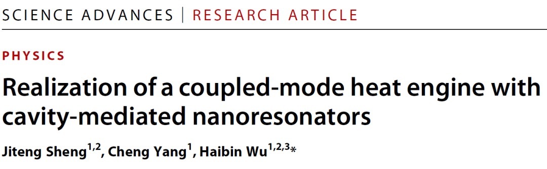 该成果以“Realization of a coupled-mode heat engine with cavity-mediated nanoresonators”为题于12月8日发表在Science Advances 上。华东师范大学为论文的完成单位。紫江青年盛继腾研究员为该工作第一作者,武海斌教授为论文的通讯作者。