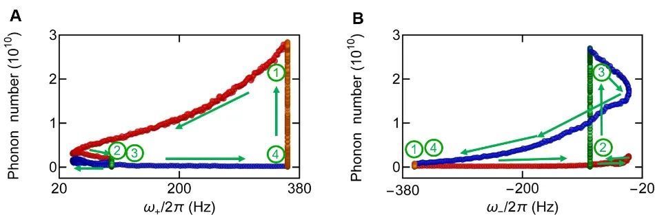 通过对两个微纳振子运动模式的实时测量,得到本征模式的实时声子数,分析了单缸Otto热机的热力学循环和做功效率。图中红点表示本征模在热力学循环中的做功冲程(实验上该冲程的扫描时间可控)。