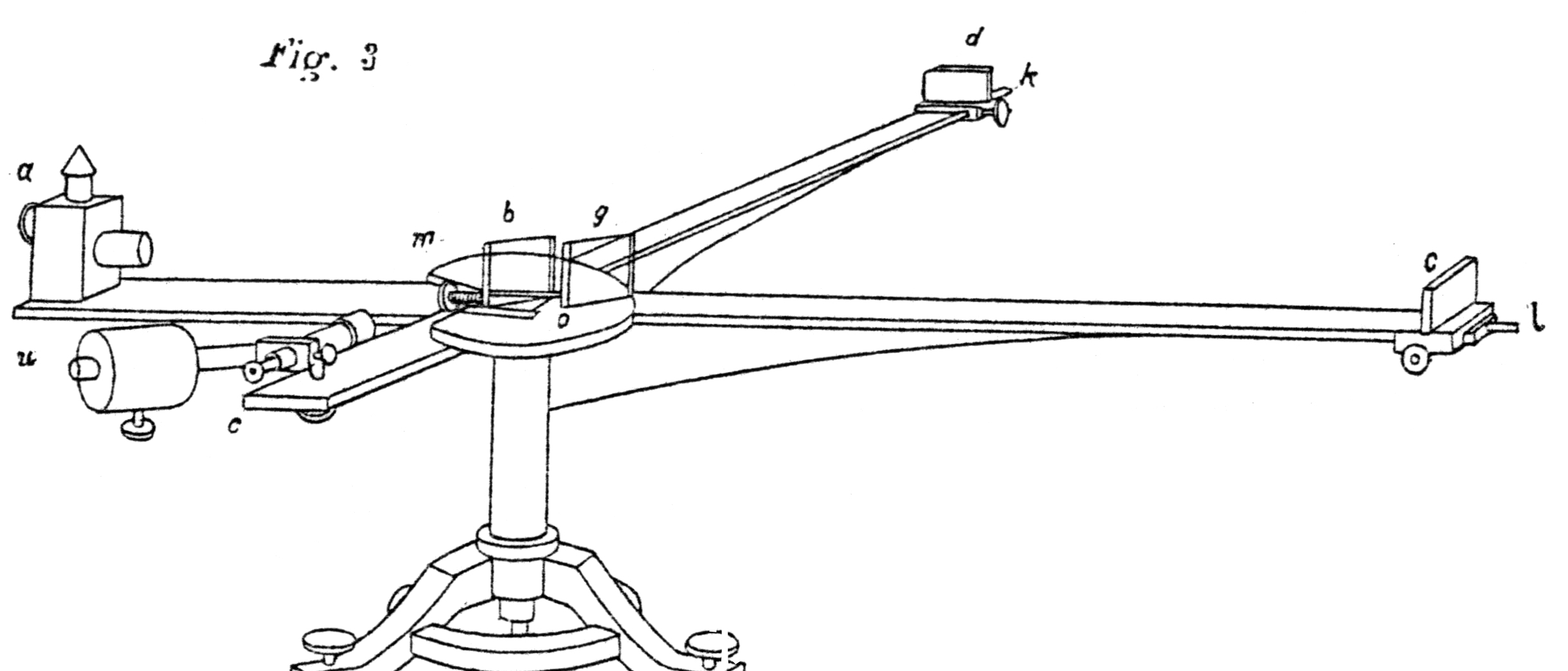 1881年迈克尔逊首次进行了检测以太的实验,按照最初的设想,地球绕着太阳在以太中运动,只要转动干涉仪的角度,那么以太就不会对其中一条悬臂上的光速产生影响,因为两条悬臂是垂直的。